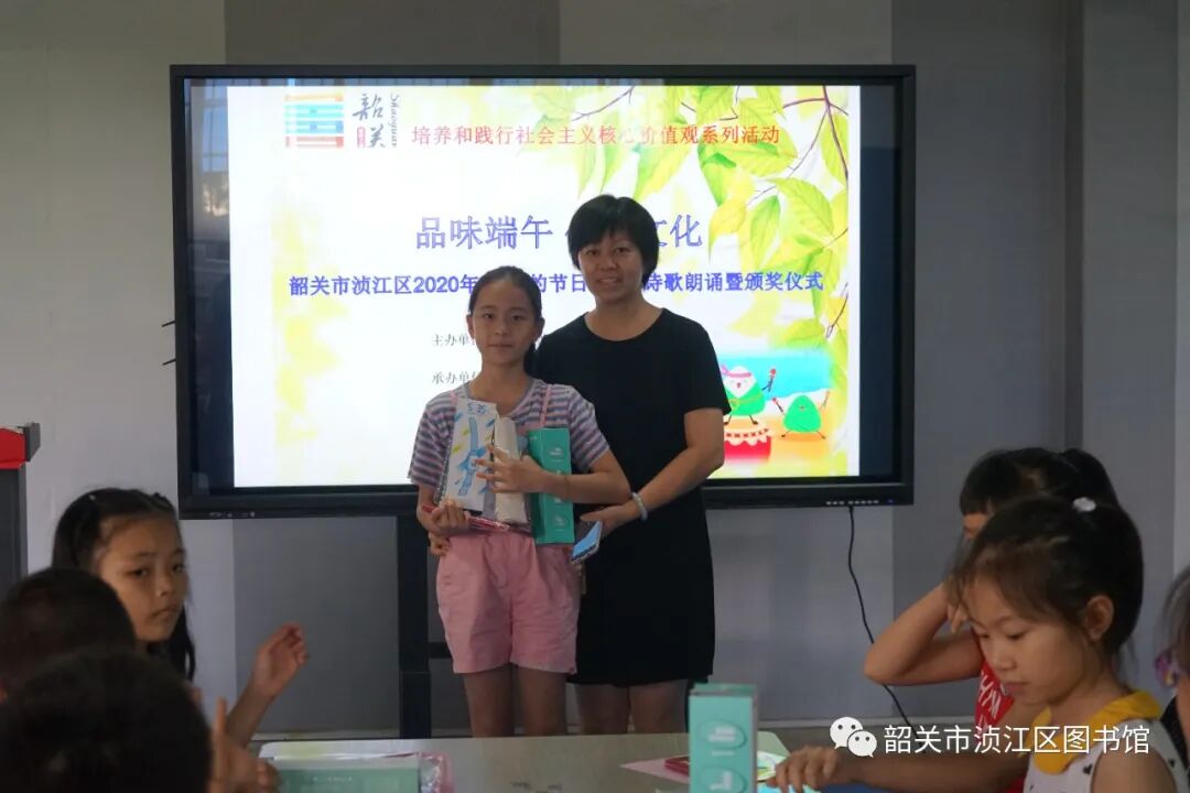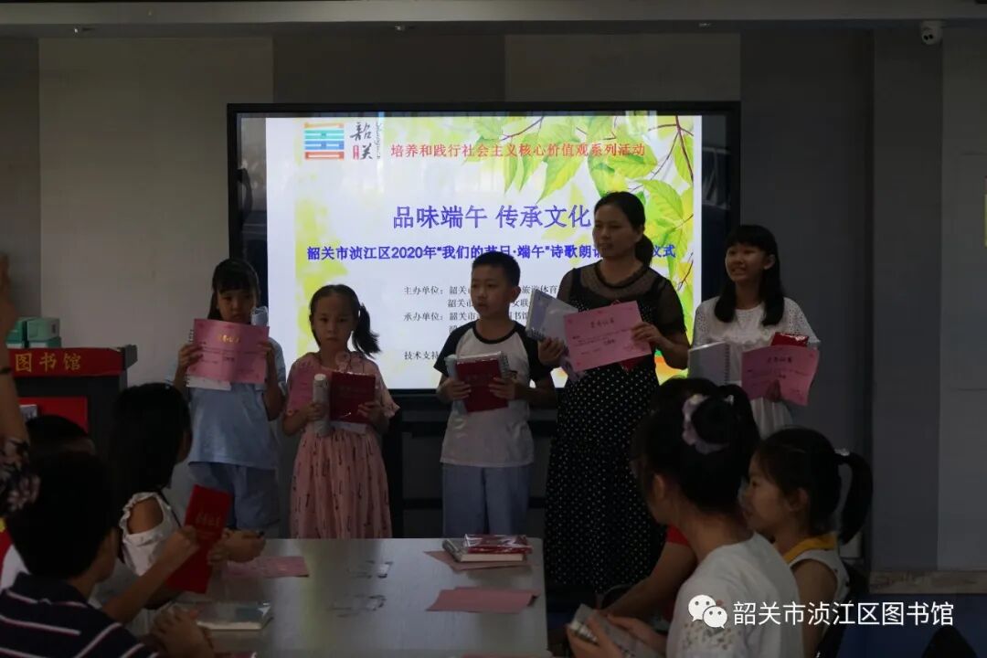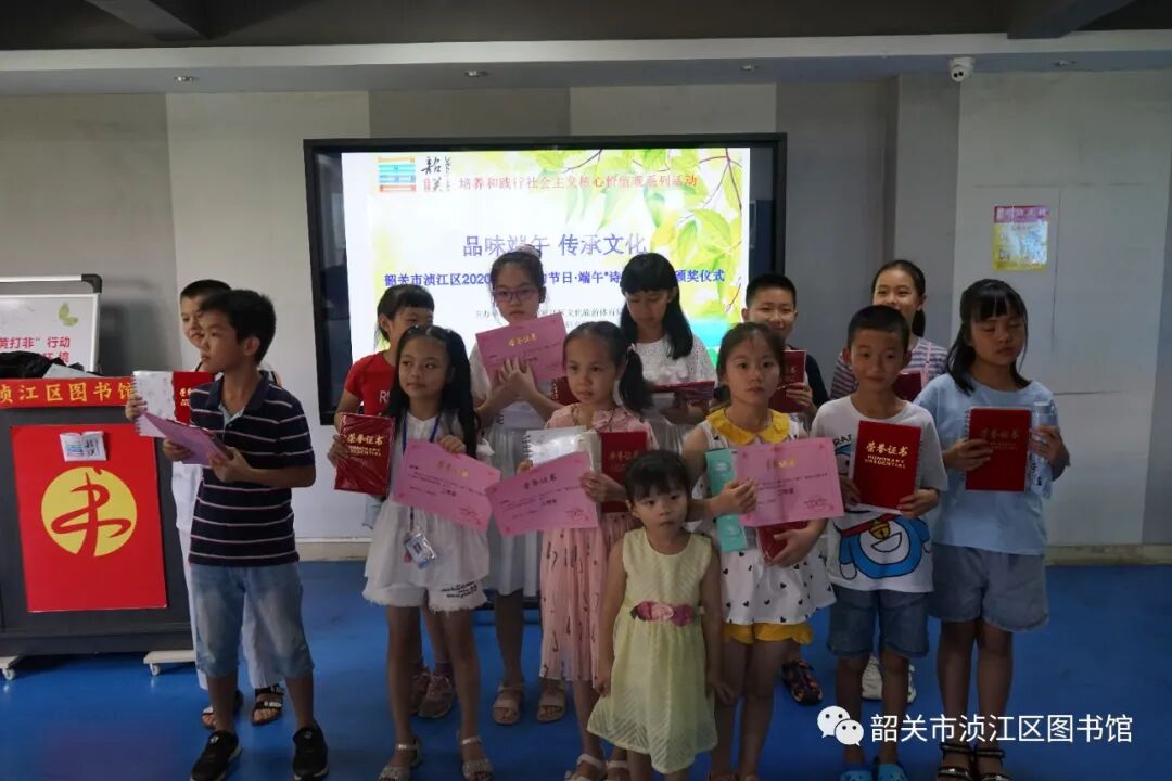 2020年7月11日下午三点,2020年浈江区“我们的节日·端午”暨浈江区图书馆、文化馆总分馆端午朗诵活动颁奖仪式在我馆举行。端午节前我馆开展了《讴歌社会主义核心价值观》的线上朗诵活动,经过活动开展、作品收集、后台审核、专家评分等环节后,得出一等奖1名,二等奖3名,三等奖5名,优秀奖8名。