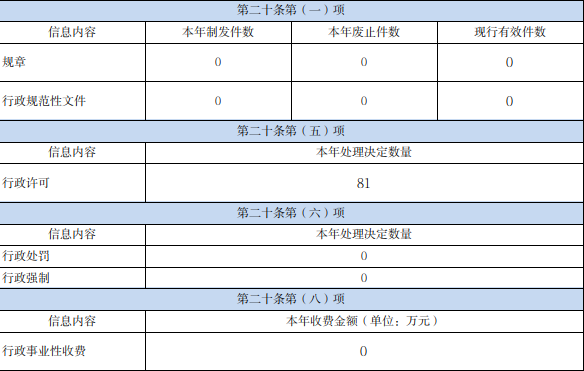 (一)主动公开方面。依托政府信息公开平台,全面公开规章文件、组织机构、行政许可、行政处罚、财政预决算等政府信息。2025年公开发布政府规章0件,行政规范性文件0件,行政许可处理决定81项,行政处罚处理决定0项,行政强制处理决定0项,行政事业性收费0万元。